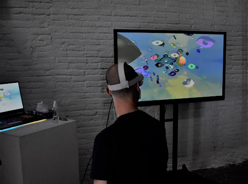 During the experience the virtual space becomes a mysteriously unpredictable parallel world in an area between deceiving spatial perception, acoustic hallucinations. The installation is going to be experienced between the virtual and the physical, looking at the world not as physical versus digital objects but rather both entangling, both leaving residue of parts behind thus shaping one another, forging a new type of relationship between parts and wholes, involving one’s own body as a site of production and enabling imagination to travel to new statuses, combinations and hybrid formations.